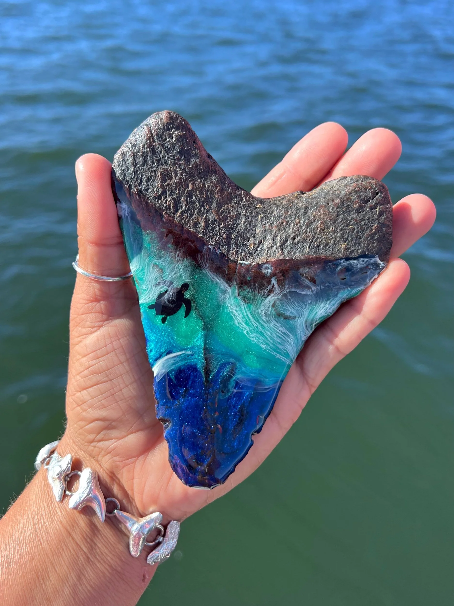 5.30β Megalodon tooth found diving offshore NC thatβs been turned into a work of art by adding an ocean-inspired epoxy resin pour.